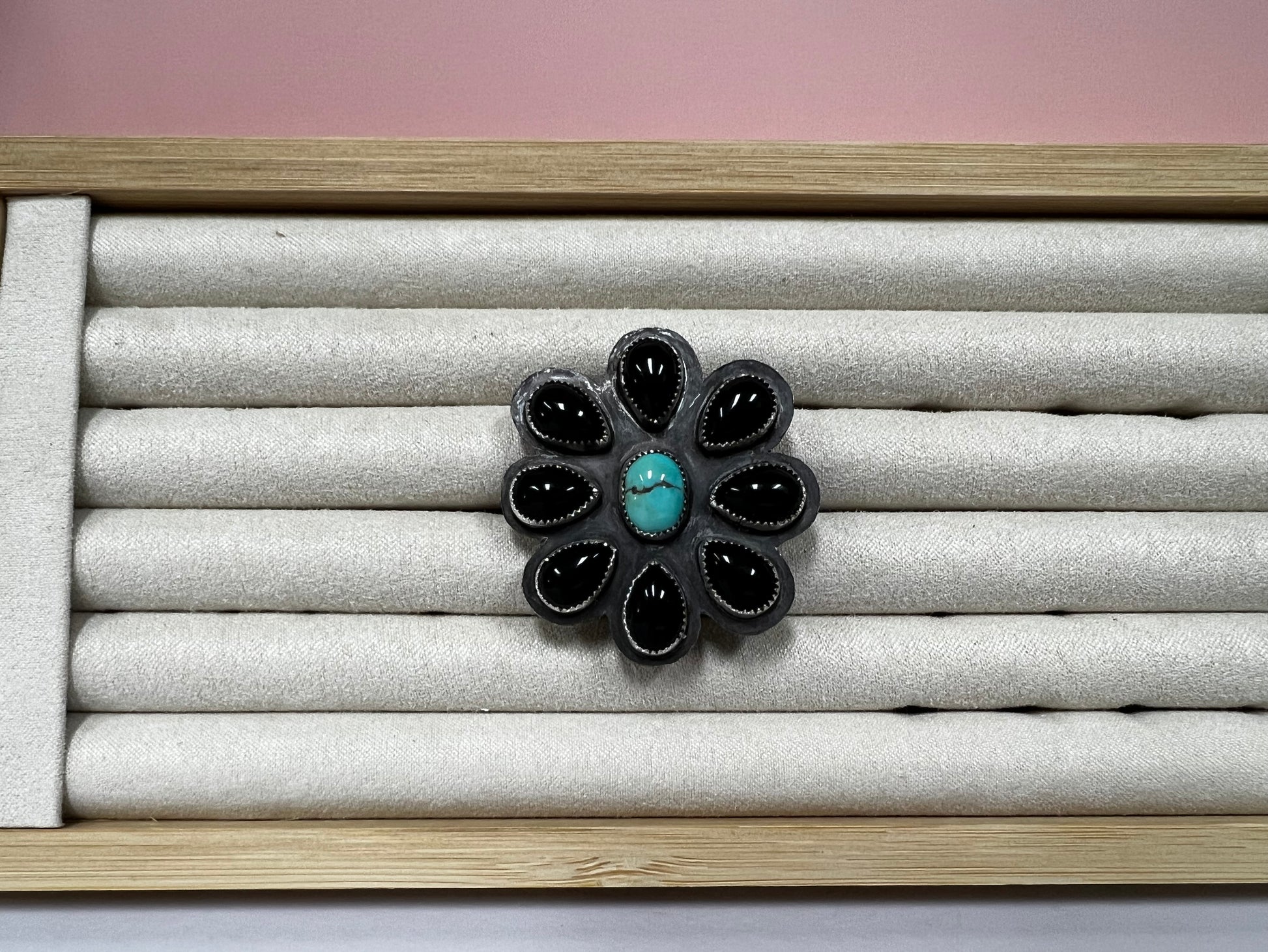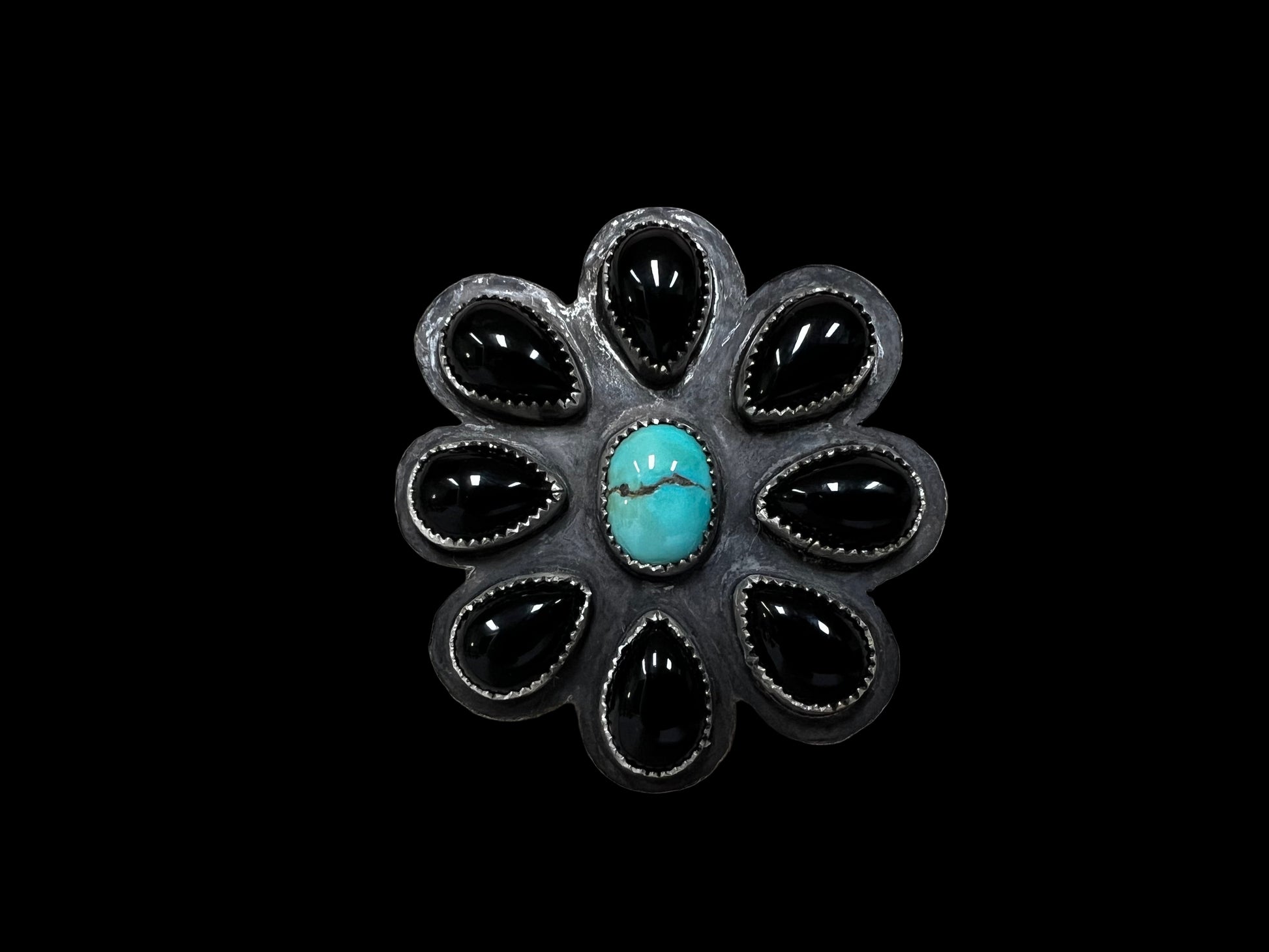 Polychrome Turquoise and Black Onyx. Sterling Silver. Adjustable Ring Band. Made by me.